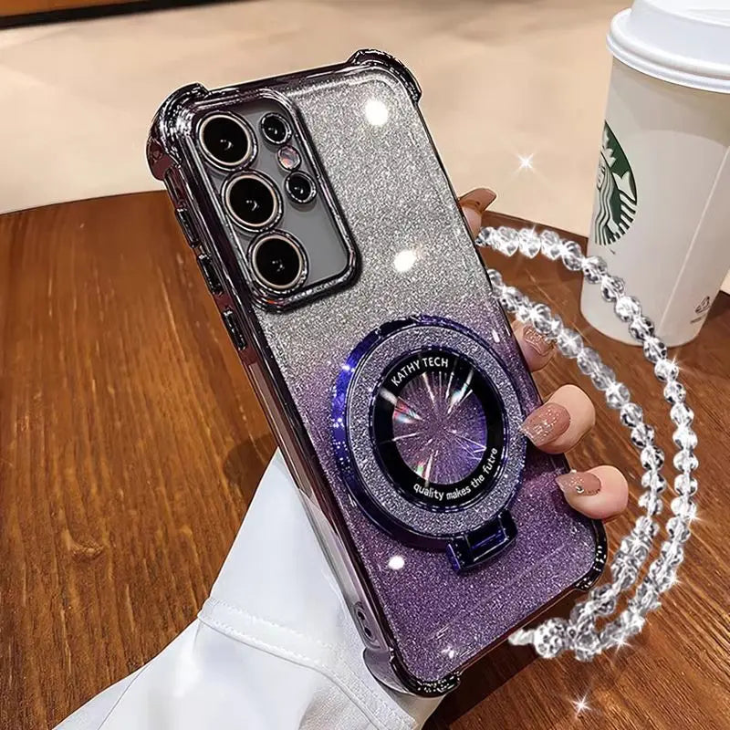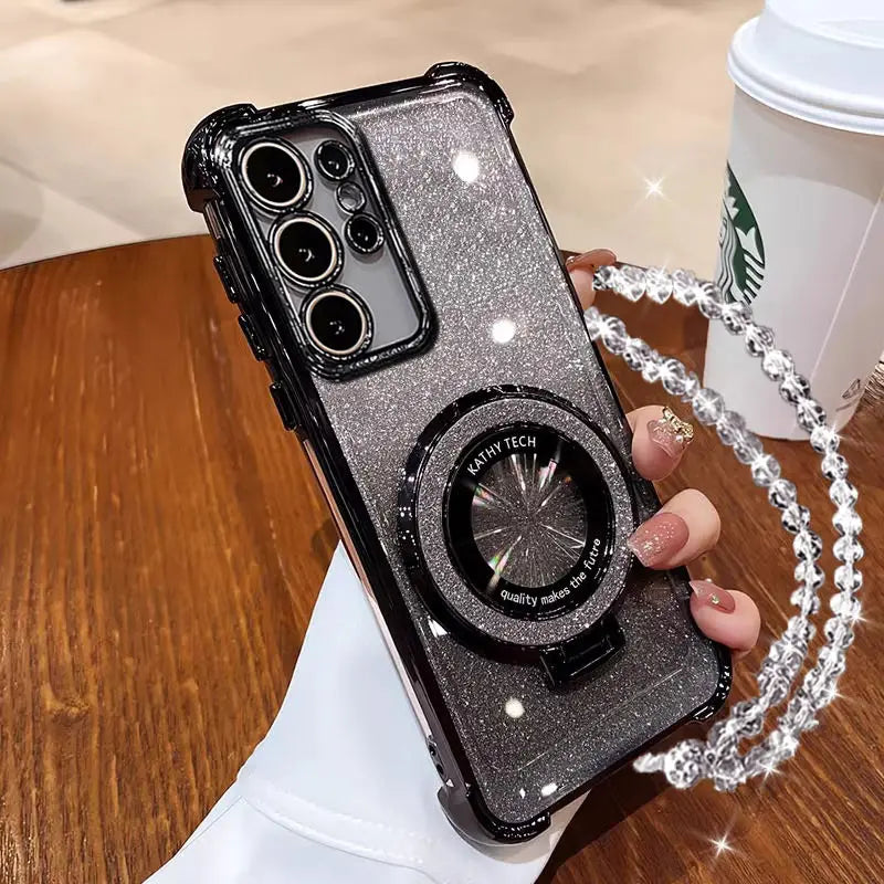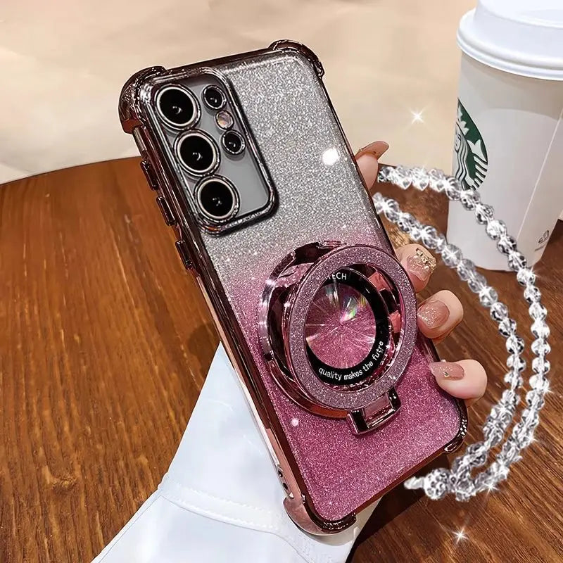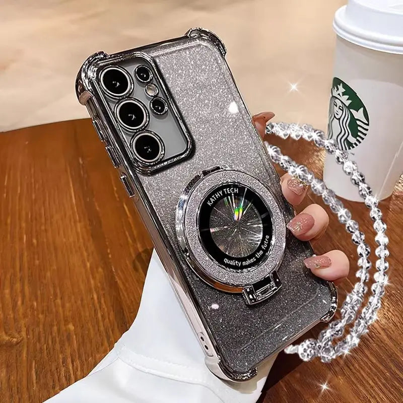 Turn heads with the GlimmerEdge Pro, a luxury phone case crafted for Samsung Galaxy S25, S24, S23, S22, S21, and S20 Series, including Plus, Ultra, and FE models. This case fuses glitter glam with practicality, featuring a shockproof plated frame, detachable chain handle, and a built-in kickstand bracket for hands-free use.