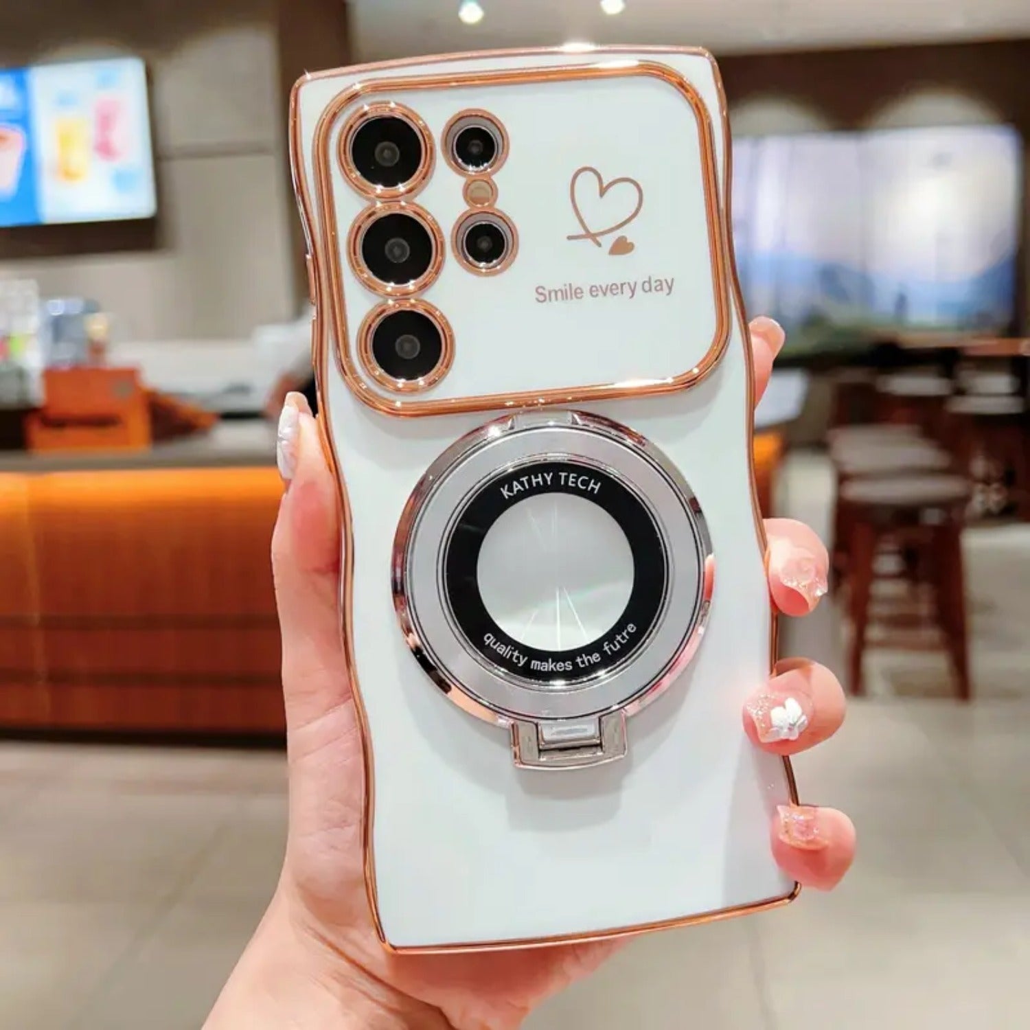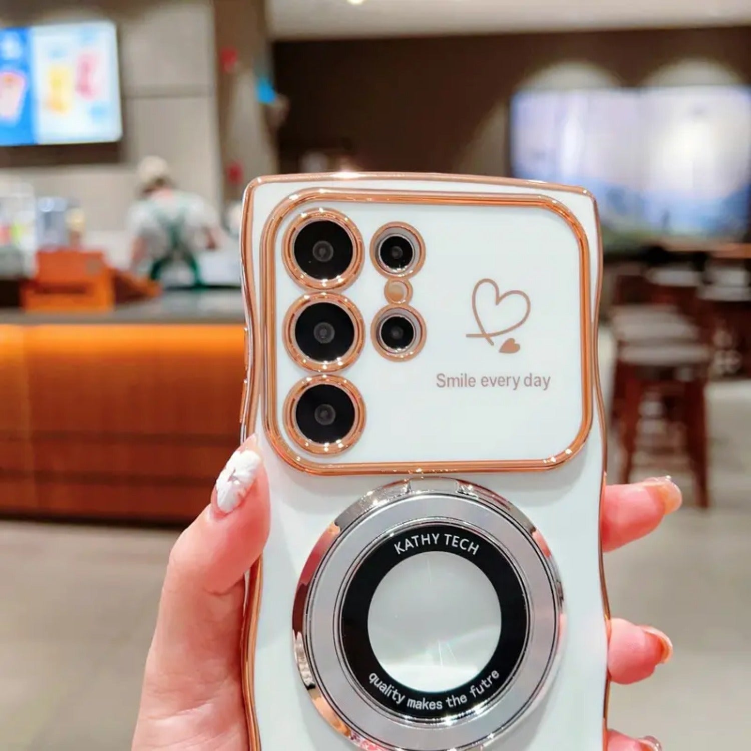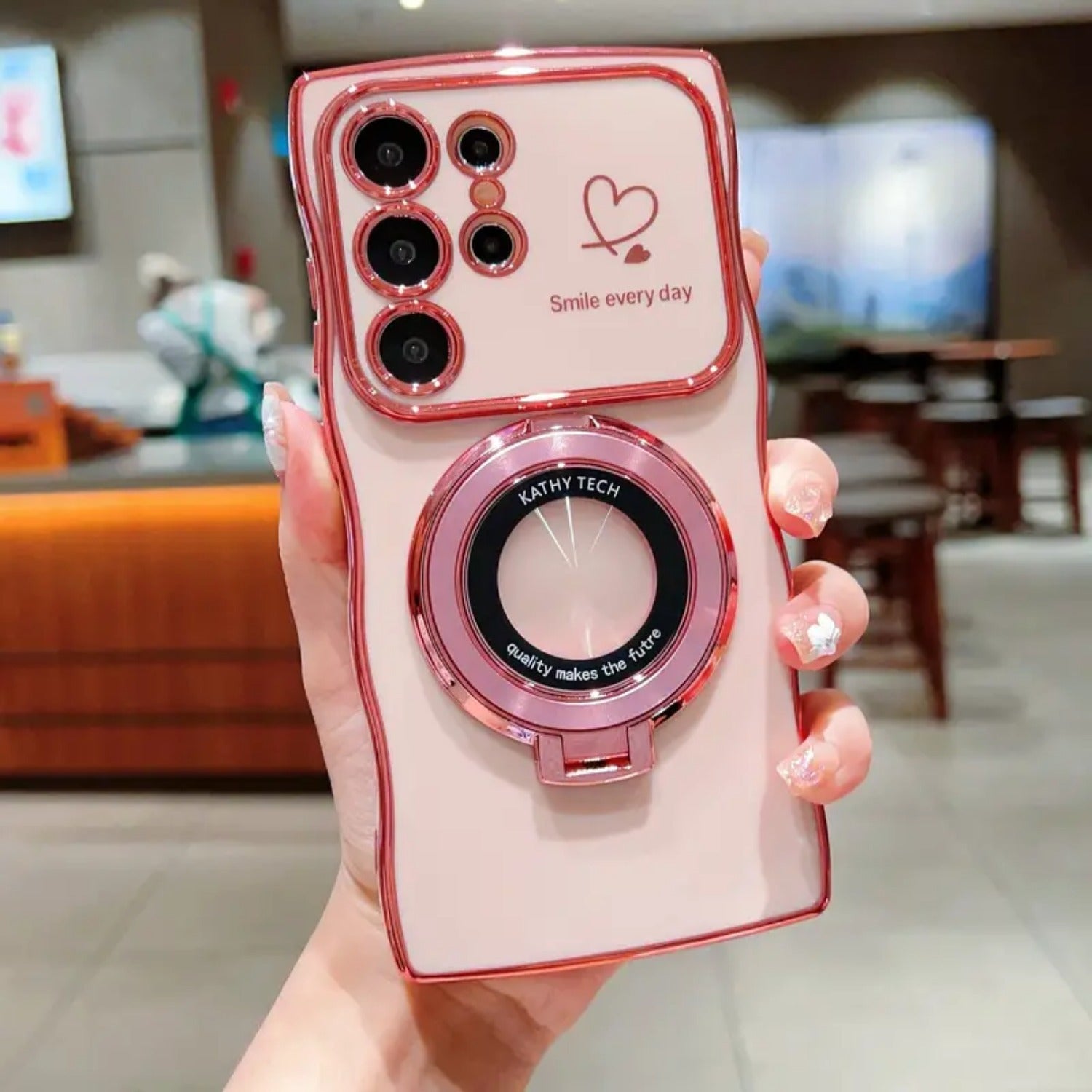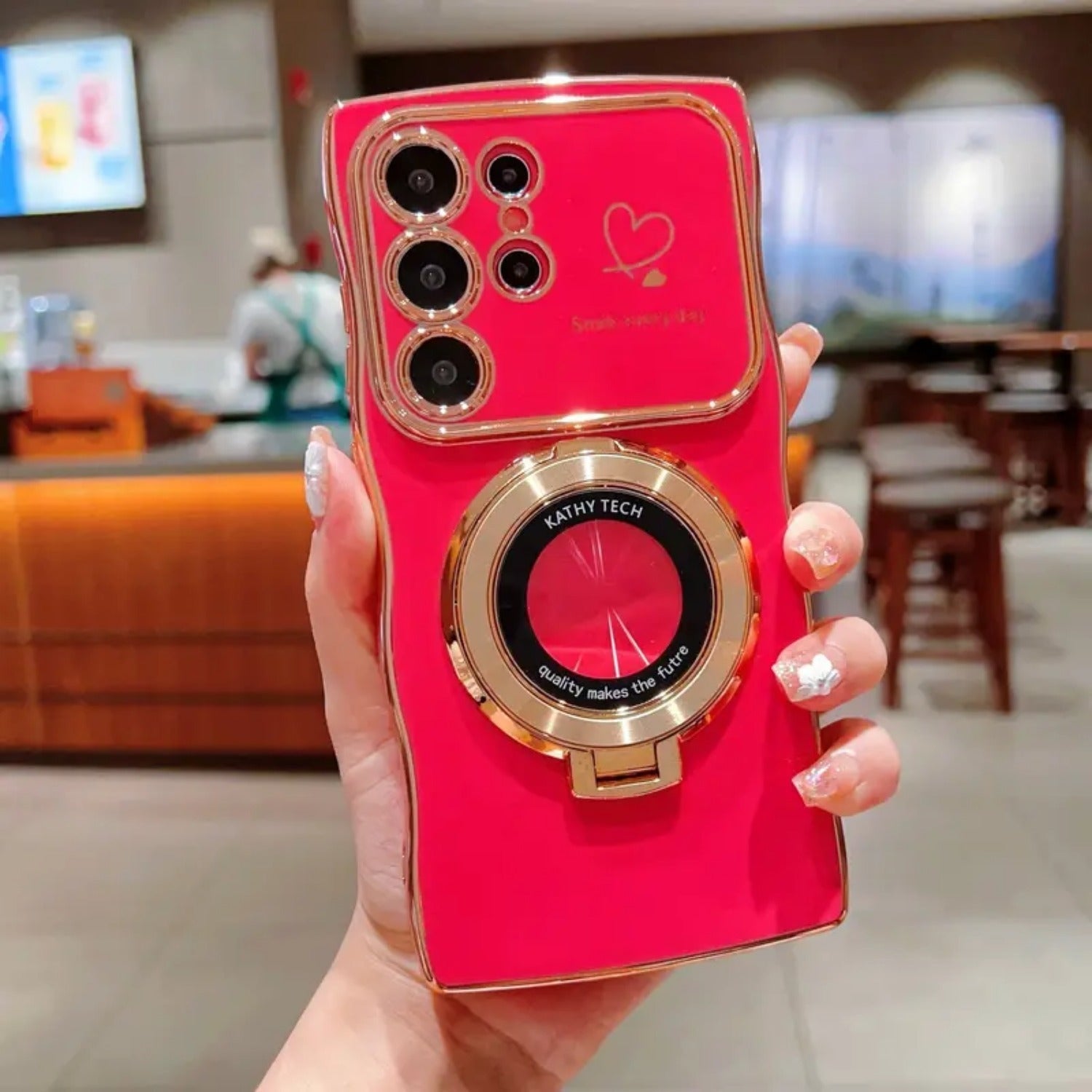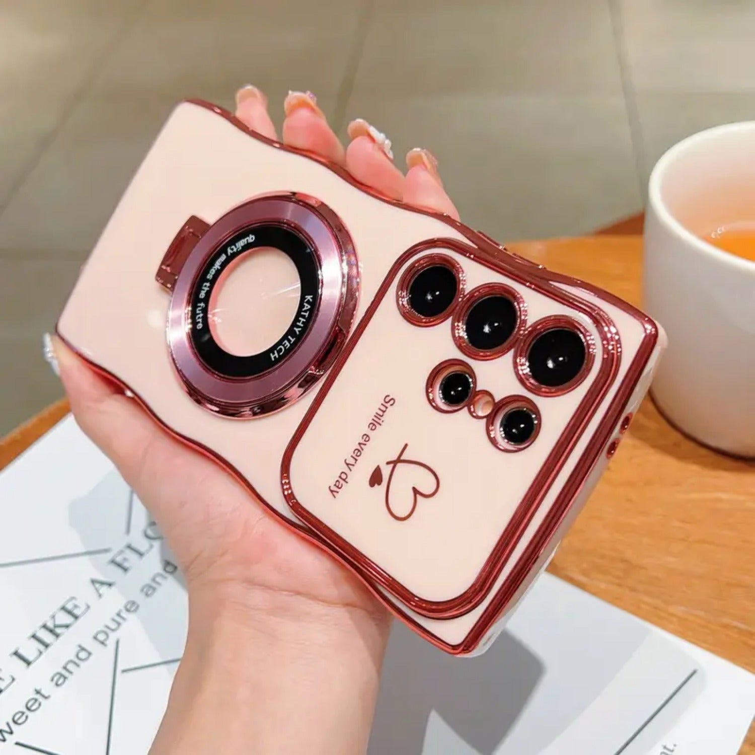 Meet the LuxeView Heart, a luxurious and fashionable phone case designed for the Samsung Galaxy S23 Ultra, S24 Ultra, and S25 Ultra. Featuring a unique heart-shaped side pattern, a large interactive window, and a built-in stand, this case combines charm with practicality. Perfect for those who love stylish protection with easy access to notifications.