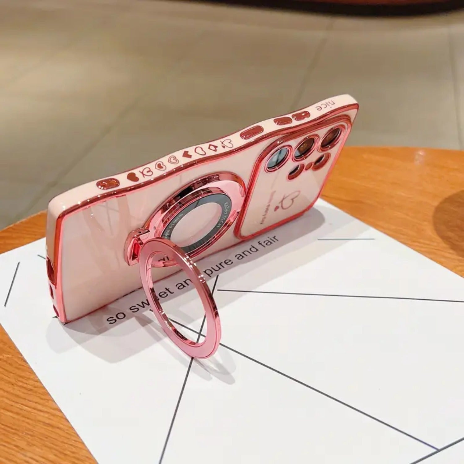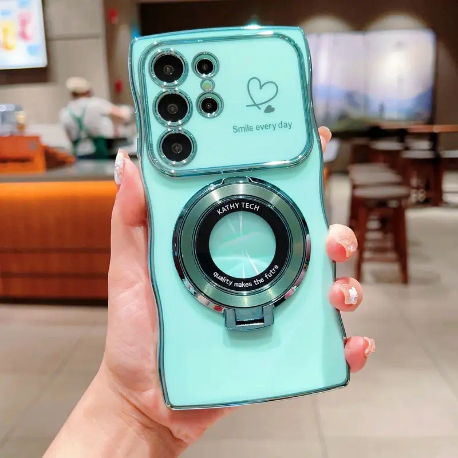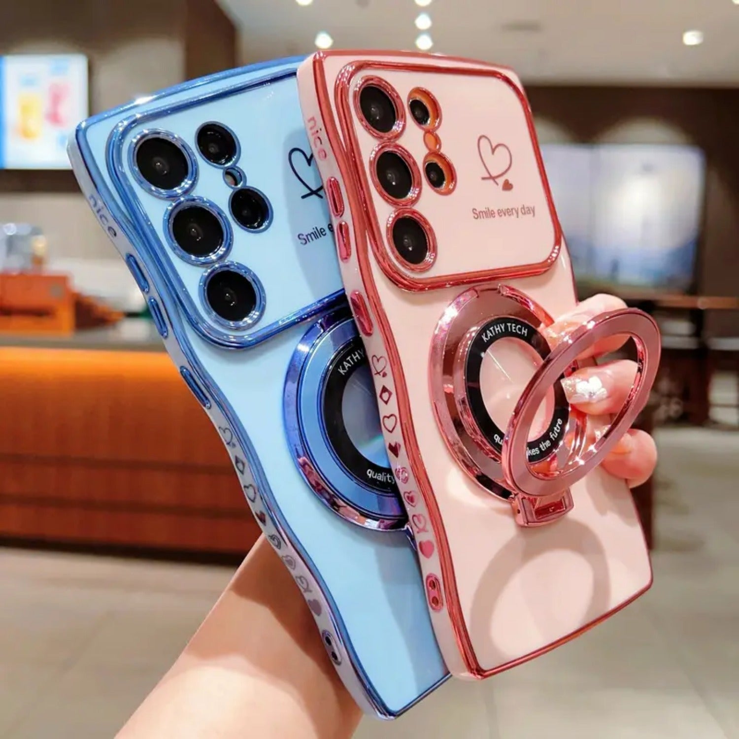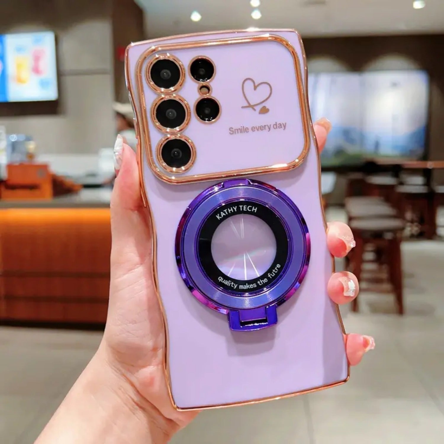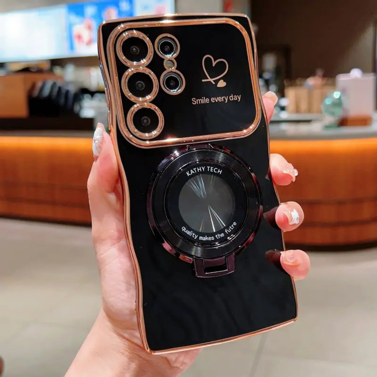 Meet the LuxeView Heart, a luxurious and fashionable phone case designed for the Samsung Galaxy S23 Ultra, S24 Ultra, and S25 Ultra. Featuring a unique heart-shaped side pattern, a large interactive window, and a built-in stand, this case combines charm with practicality. Perfect for those who love stylish protection with easy access to notifications.