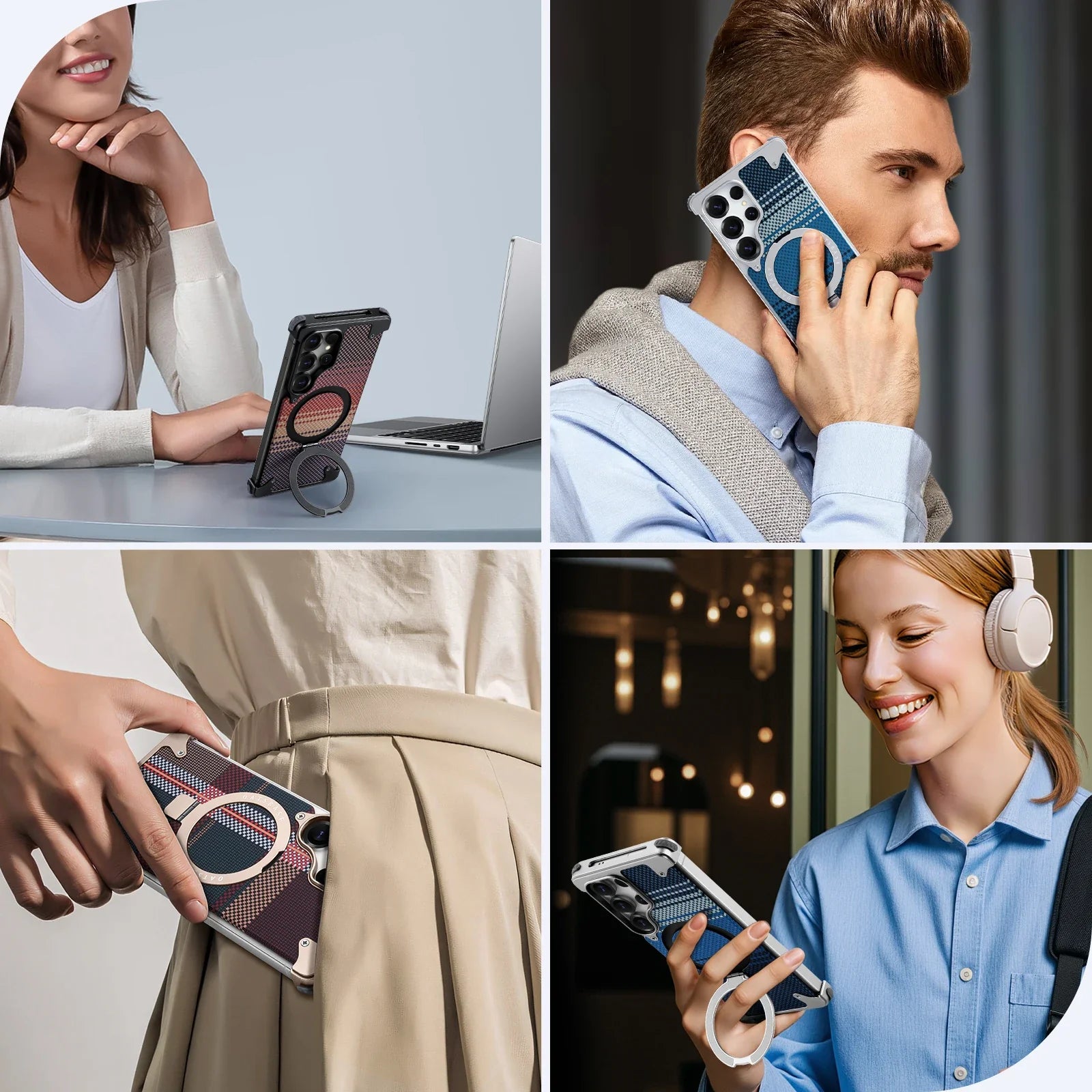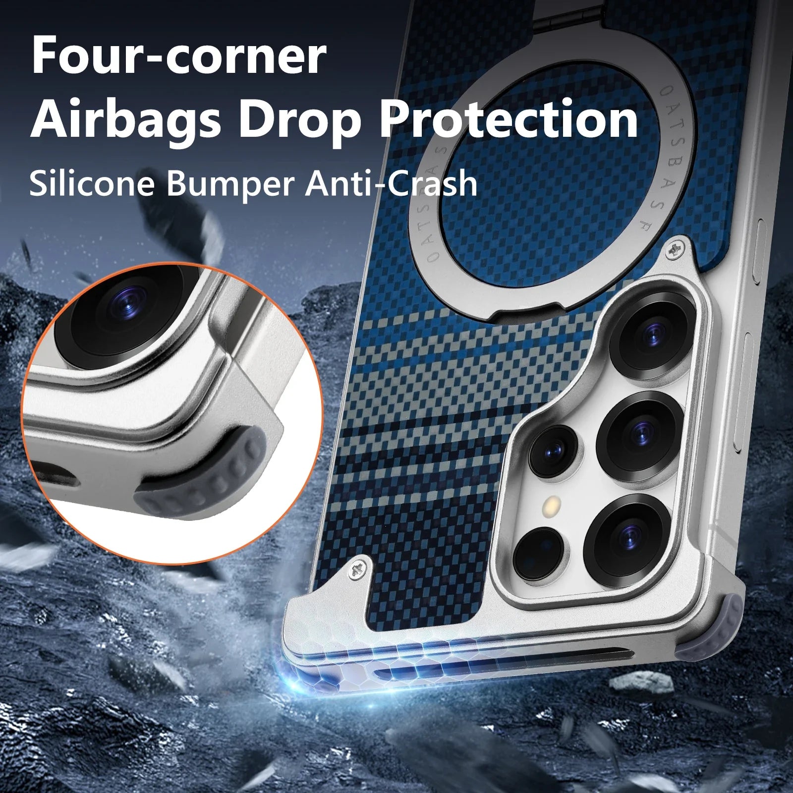 Introducing the MagFrame Carbon, a premium MagSafe-compatible phone case built for the Samsung Galaxy S25 Ultra. Featuring a frameless metal build, carbon fiber texture, and a foldable stand, this shockproof case is designed for durability, convenience, and magnetic charging compatibility. It offers full edge protection without sacrificing style or bulk.