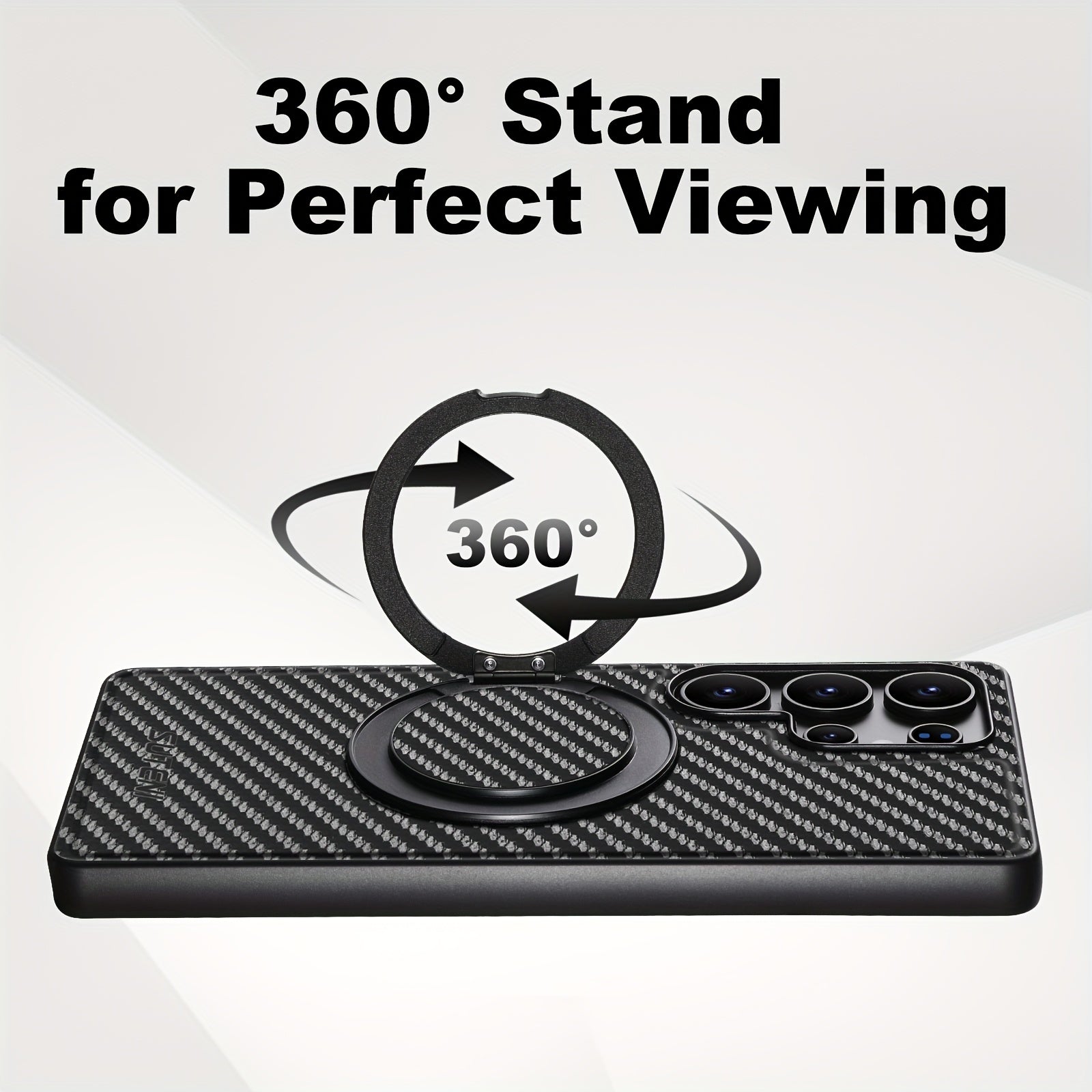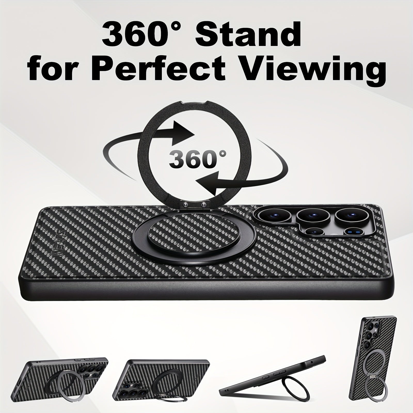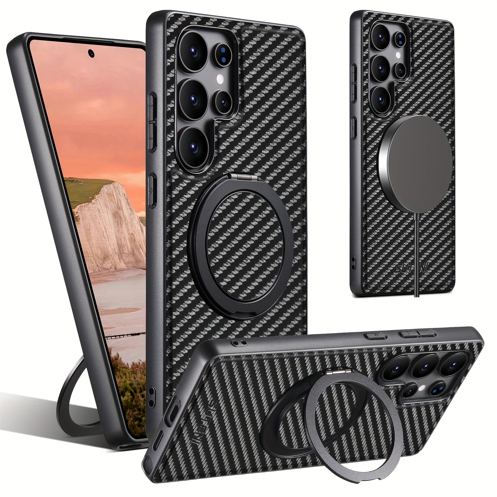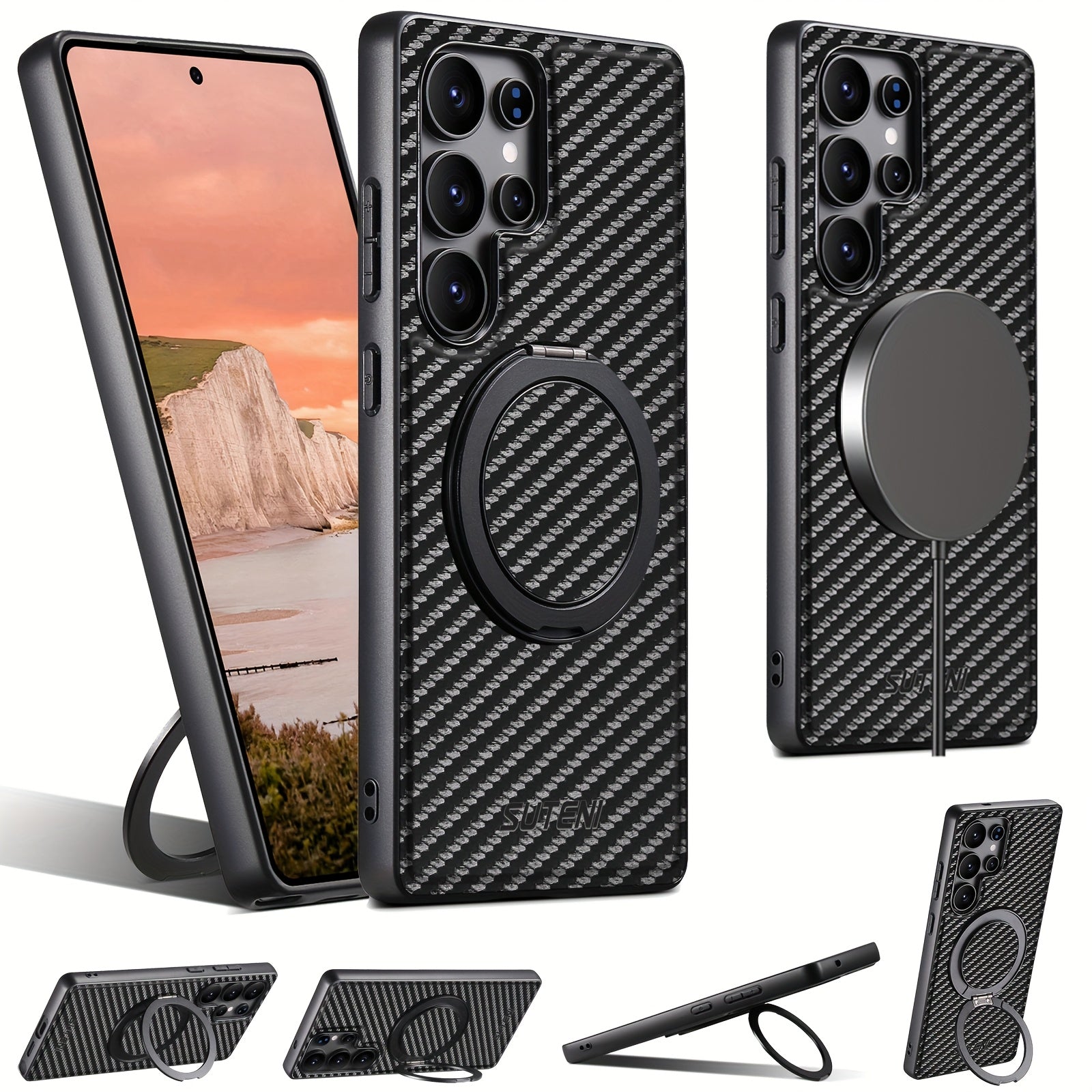 Designed for the Galaxy S22 Ultra, S23 Ultra, S24 Ultra, and S25 Ultra, this case features a 360° rotating magnetic ring stand, MagSafe compatibility, and a reinforced faux leather + carbon fiber blend for all-around shockproof protection.