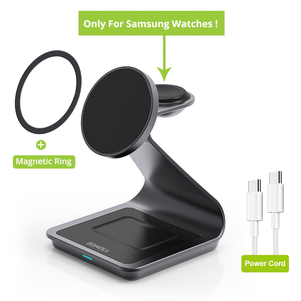 Power up your entire Galaxy ecosystem with the TriCharge Pro, a magnetic 3-in-1 wireless charging station designed for Samsung Galaxy S21/S22/S23/S24/S25 Ultra and Plus models. This sleek charger delivers 15W fast charging for phones, Galaxy Watch Ultra/7/6/5/4 Classic, and Buds 3 Pro—all at once. Built with a durable metal stand, it’s the ultimate space-saving solution for your nightstand or desk.